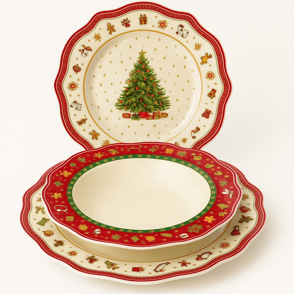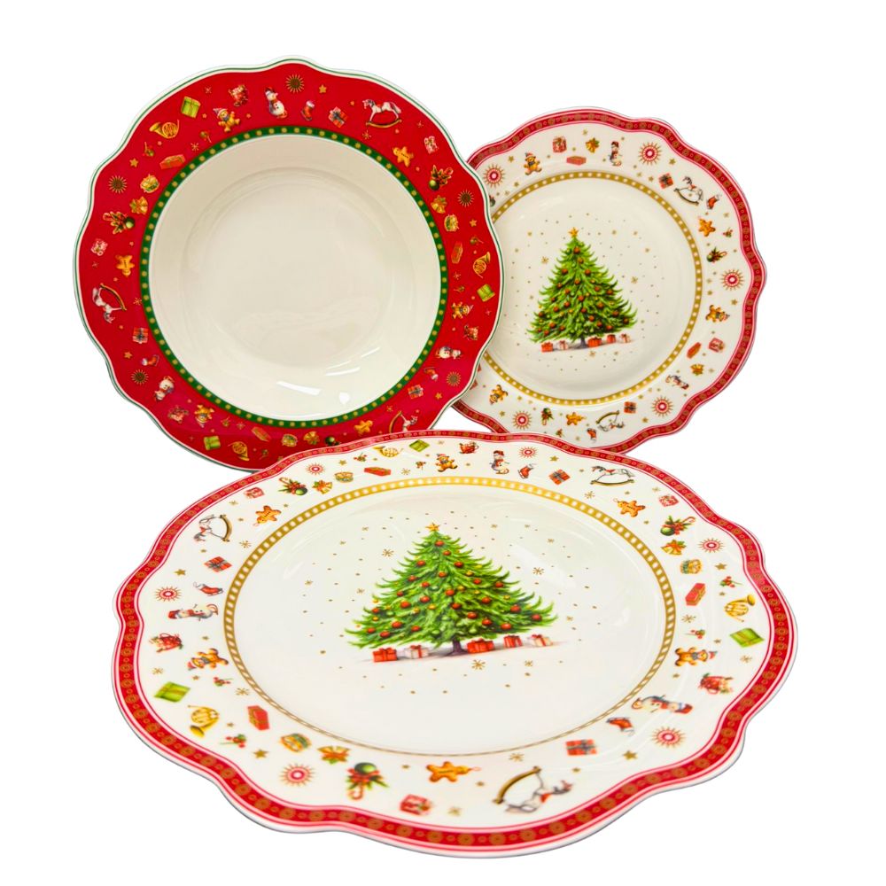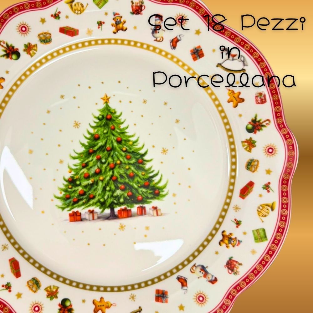 Porta la magia del Natale sulla tua tavola con il set da 18 pezzi in porcellana Cecaro Group, caratterizzato da un elegante decoro natalizio con Albero di Natale su sfondo bianco, impreziosito da dettagli rossi, dorati e iconografie tipiche delle feste.