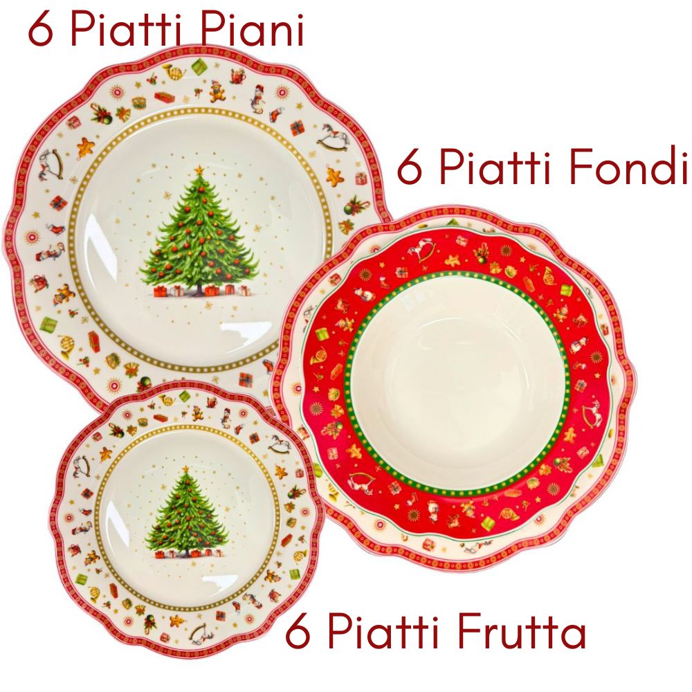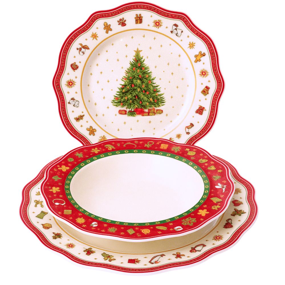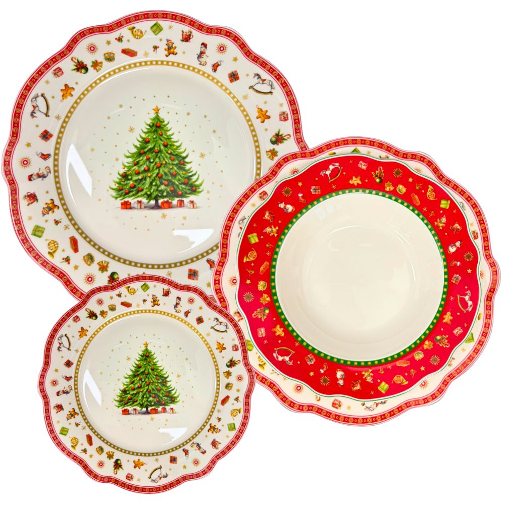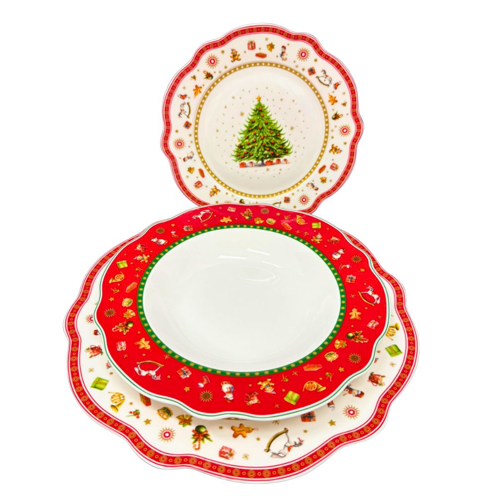 Porta la magia del Natale sulla tua tavola con il set da 18 pezzi in porcellana Cecaro Group, caratterizzato da un elegante decoro natalizio con Albero di Natale su sfondo bianco, impreziosito da dettagli rossi, dorati e iconografie tipiche delle feste.