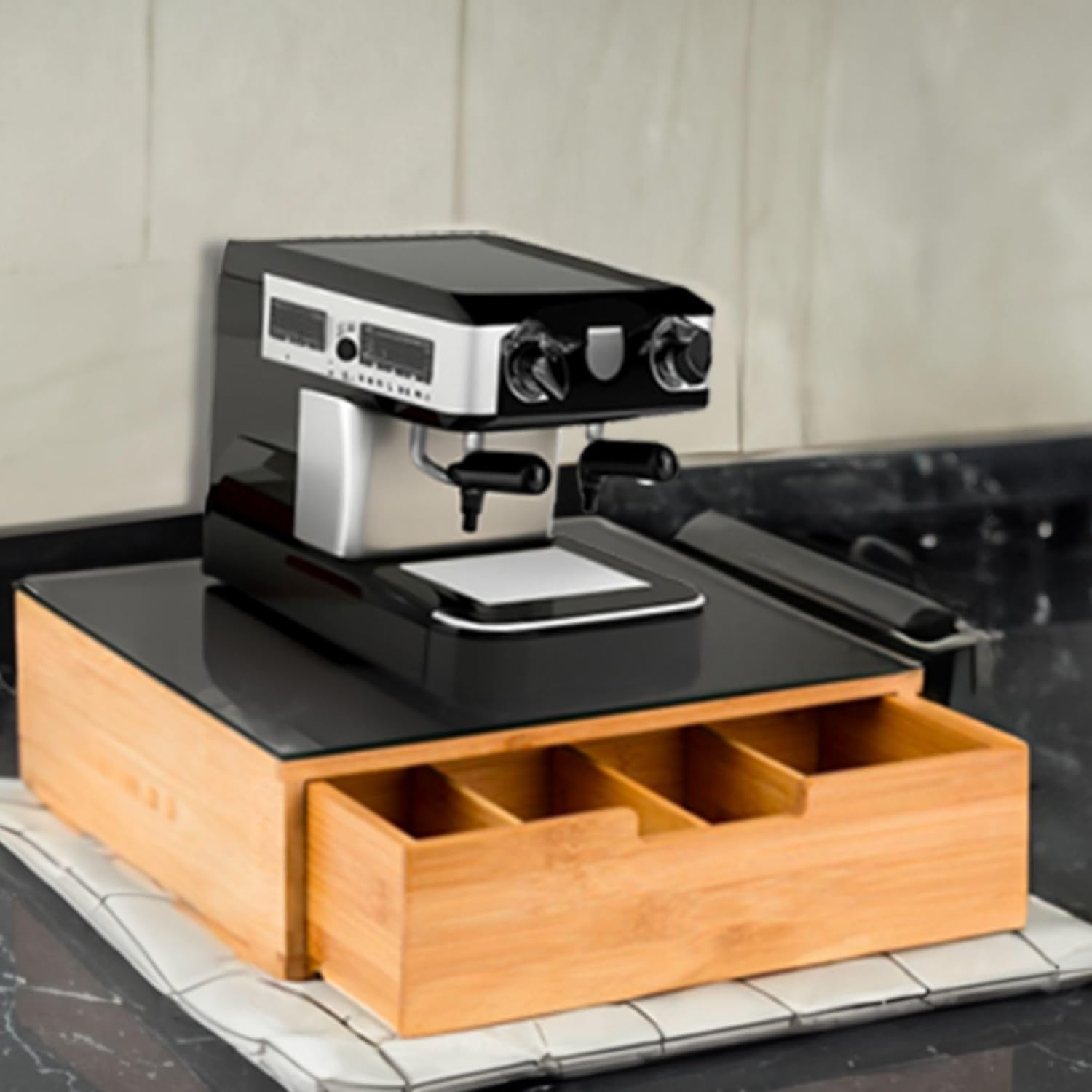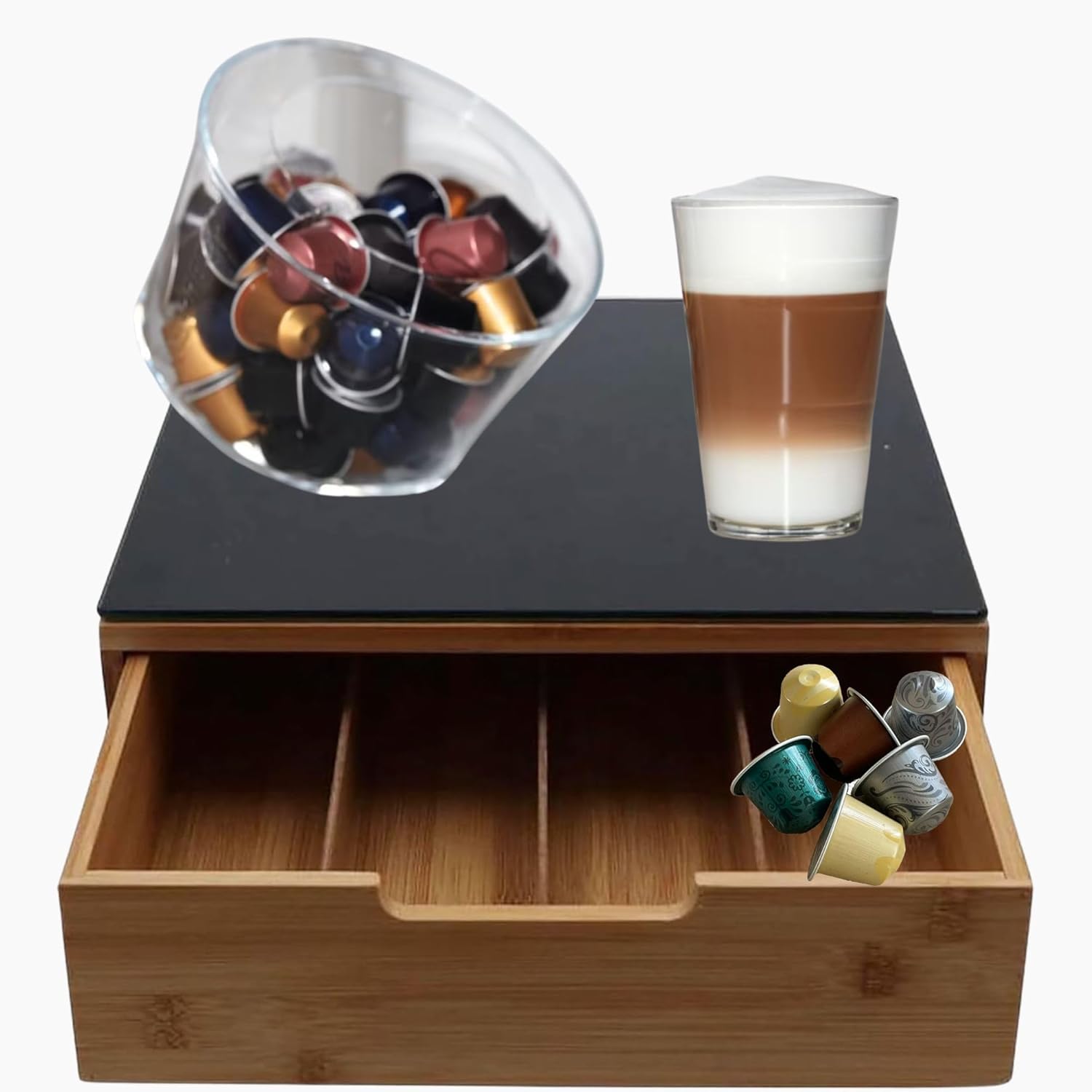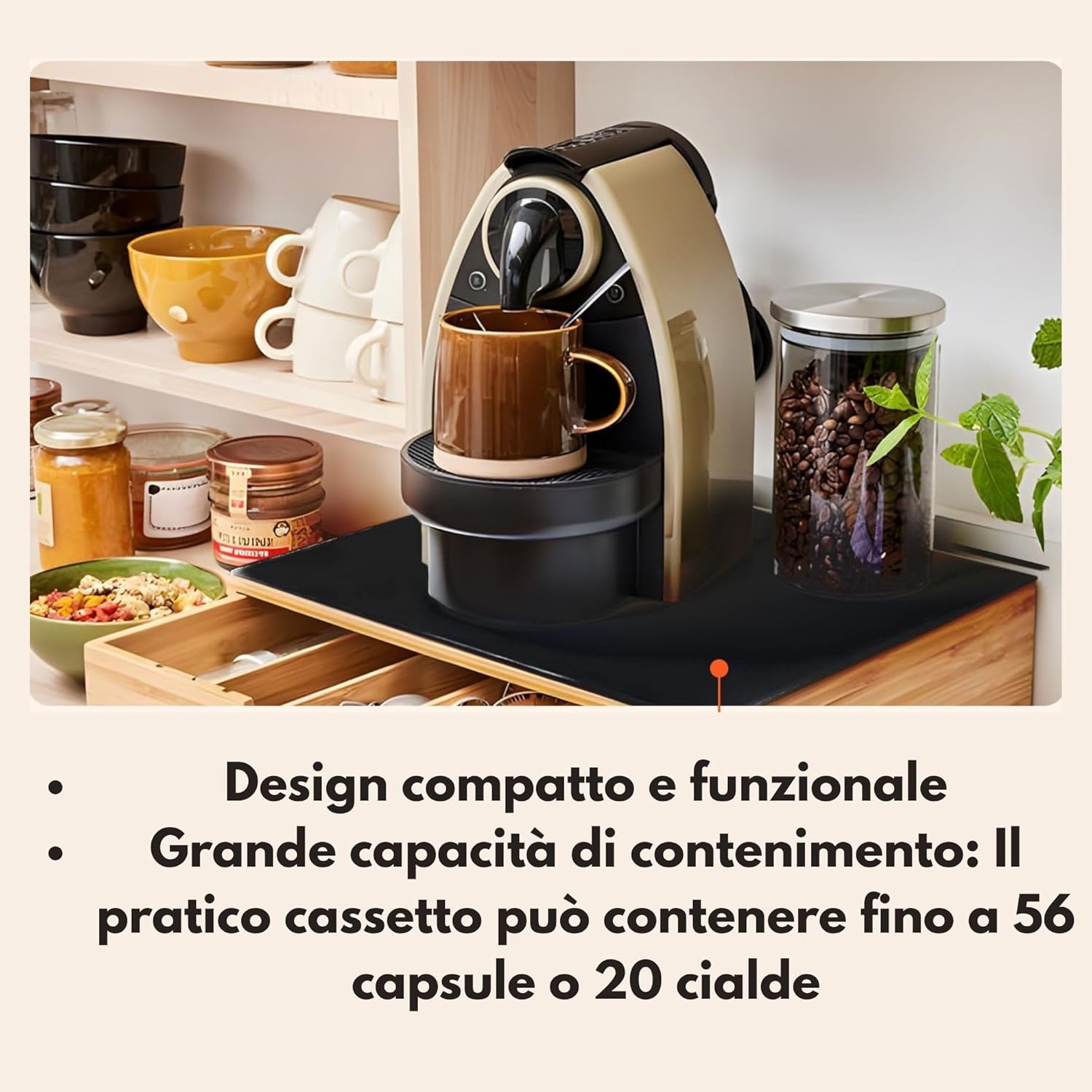 - Grande capacità di contenimento: Il pratico cassetto può contenere fino a 56 capsule o 20 cialde, offrendo al tempo stesso spazio extra per bustine di tè, zucchero o cucchiaini.