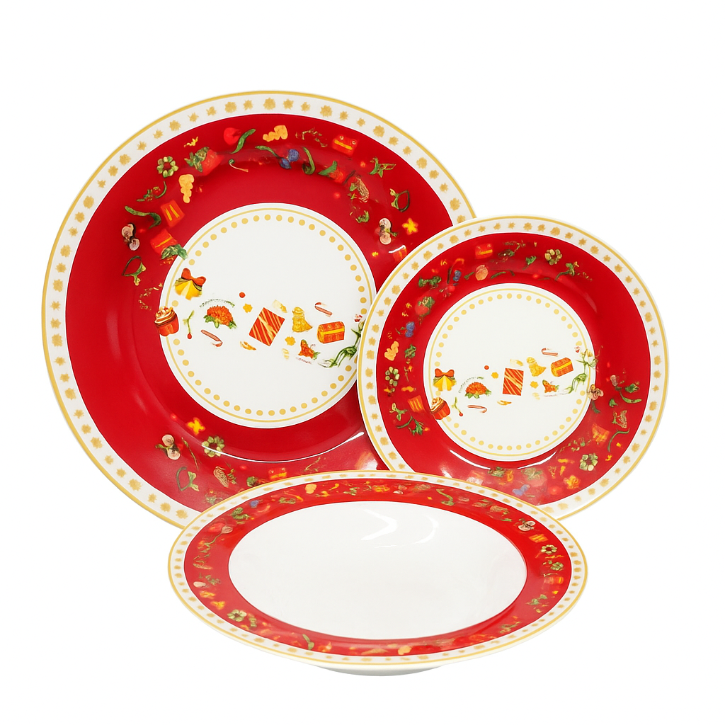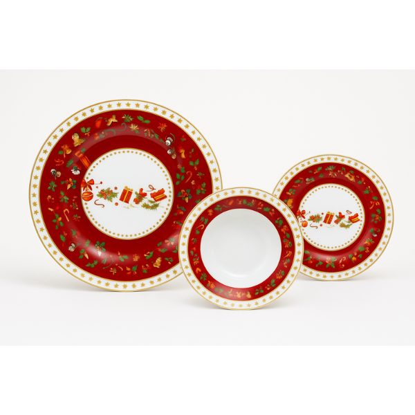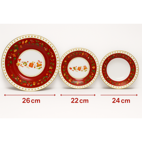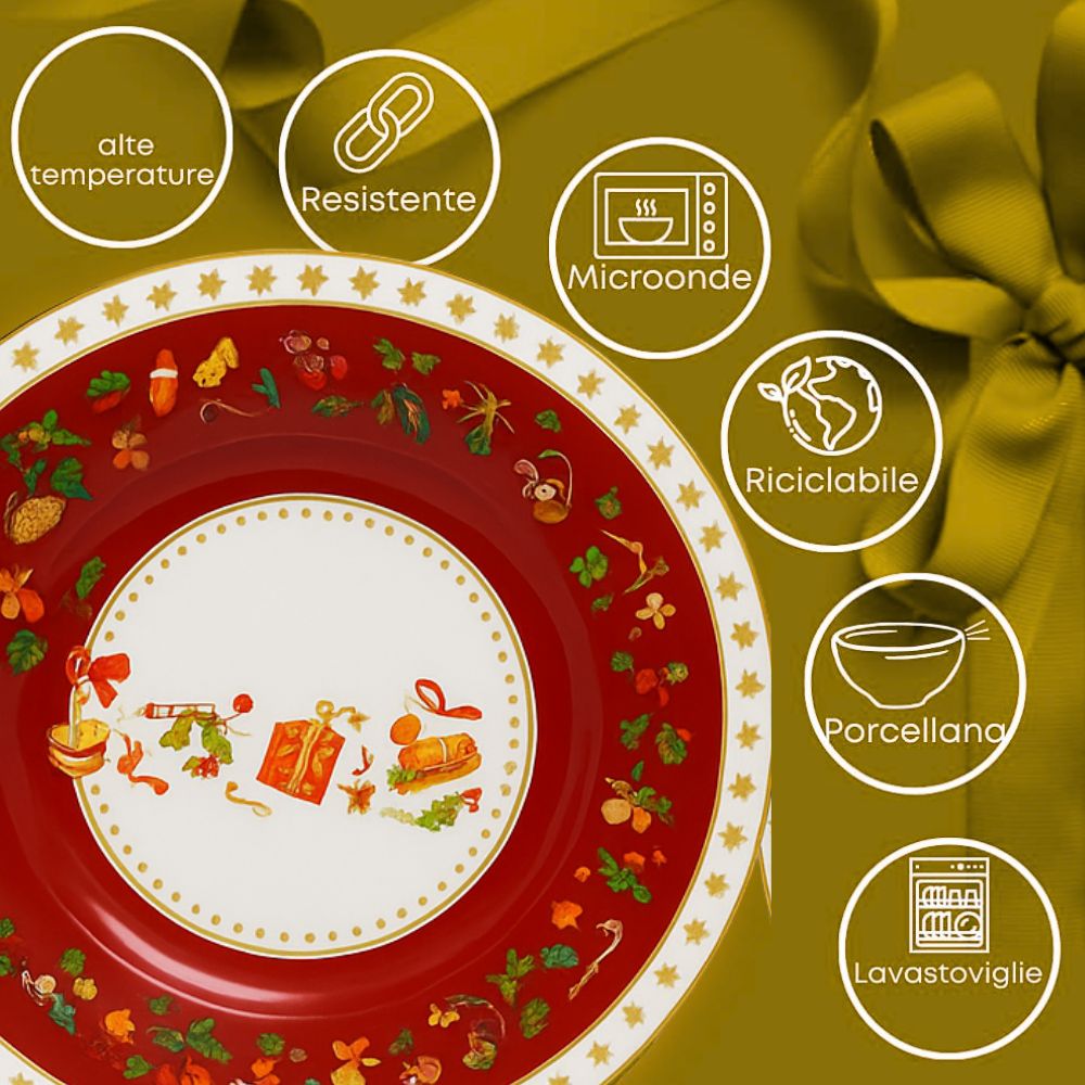 Realizzati in porcellana di alta qualità, questi piatti combinano eleganza e resistenza, perfetti per rendere uniche le cene delle festività. Il decoro raffigura una slitta natalizia colma di doni, circondata da simboli tradizionali come fiocchi, campanelle, bastoncini di zucchero e agrifoglio.