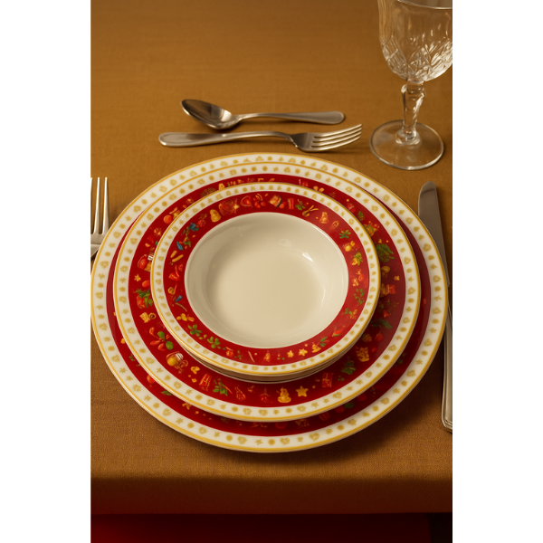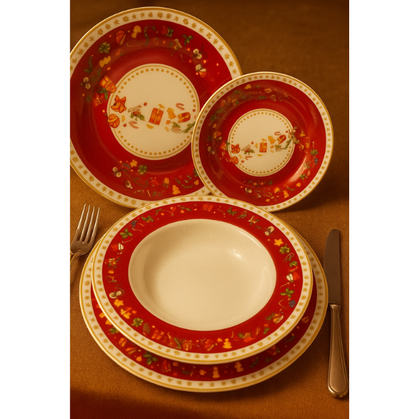 Porta sulla tua tavola tutto il calore e la magia delle feste con il set di piatti natalizi “Cecaro Group”. Questo elegante servizio da tavola per 6 persone comprende 18 pezzi finemente decorati con il vivace motivo “Slitta di Natale”, impreziosito da dettagli dorati e tonalità rosso brillante che donano un tocco festoso e raffinato alla tua mise en place.