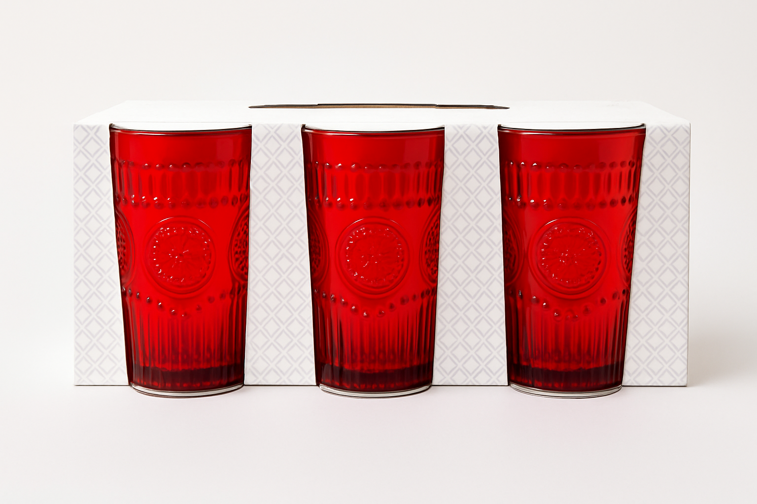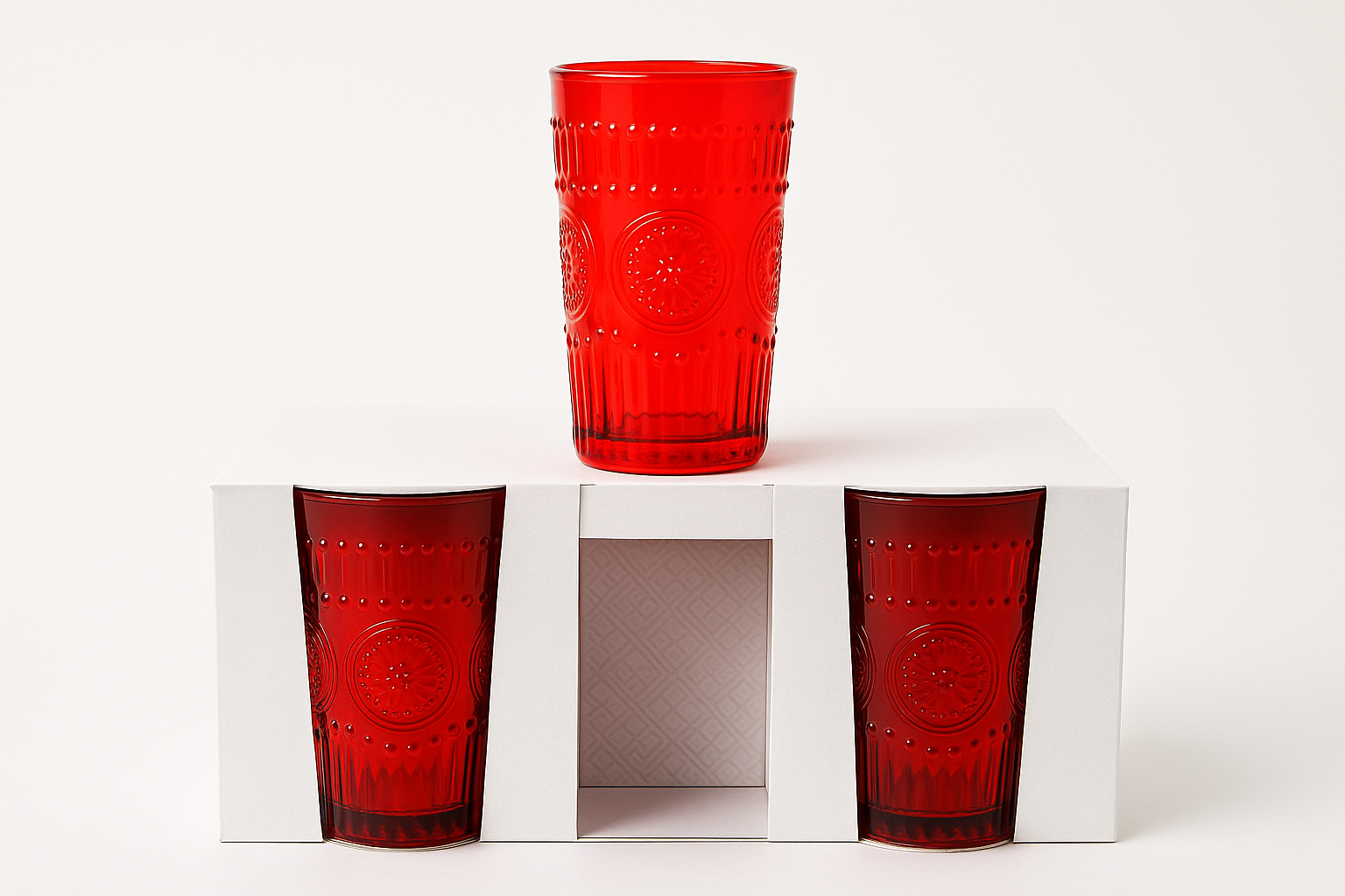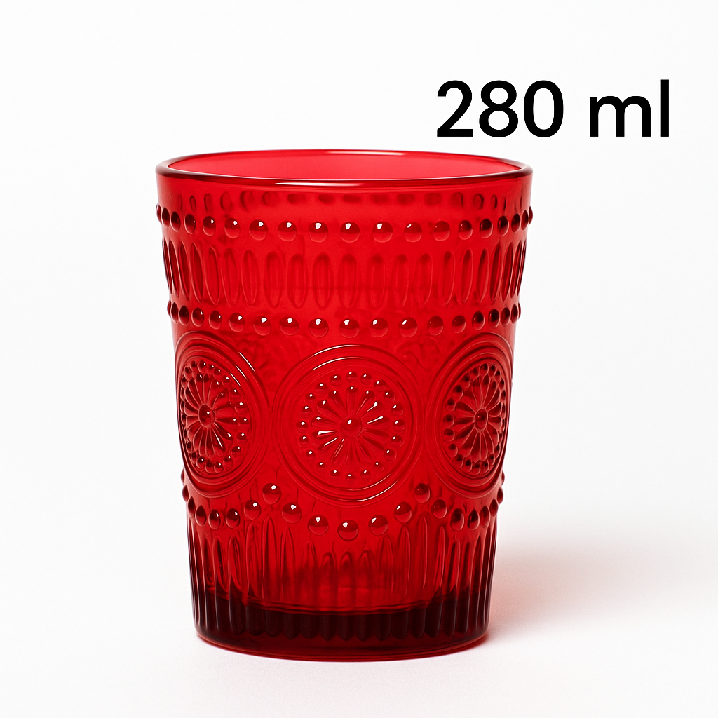 Porta sulla tua tavola la magia del Natale con questo elegante set di bicchieri in vetro rosso decorato. Realizzati in vetro resistente, hanno una capacità di 280 ml, perfetta per acqua, succhi, cocktail o vin brulé.